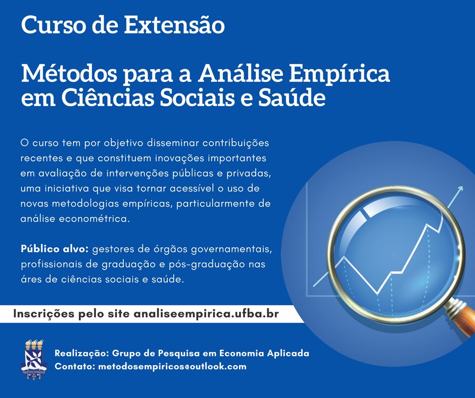 O curso tem por objetivo disseminar contribuições recentes e que constituem inovações importantes em avaliação de intervenções públicas e privadas, uma iniciativa que visa tornar acessível o uso de novas metodologias empíricas, particularmente aquelas associadas à análise econométrica.