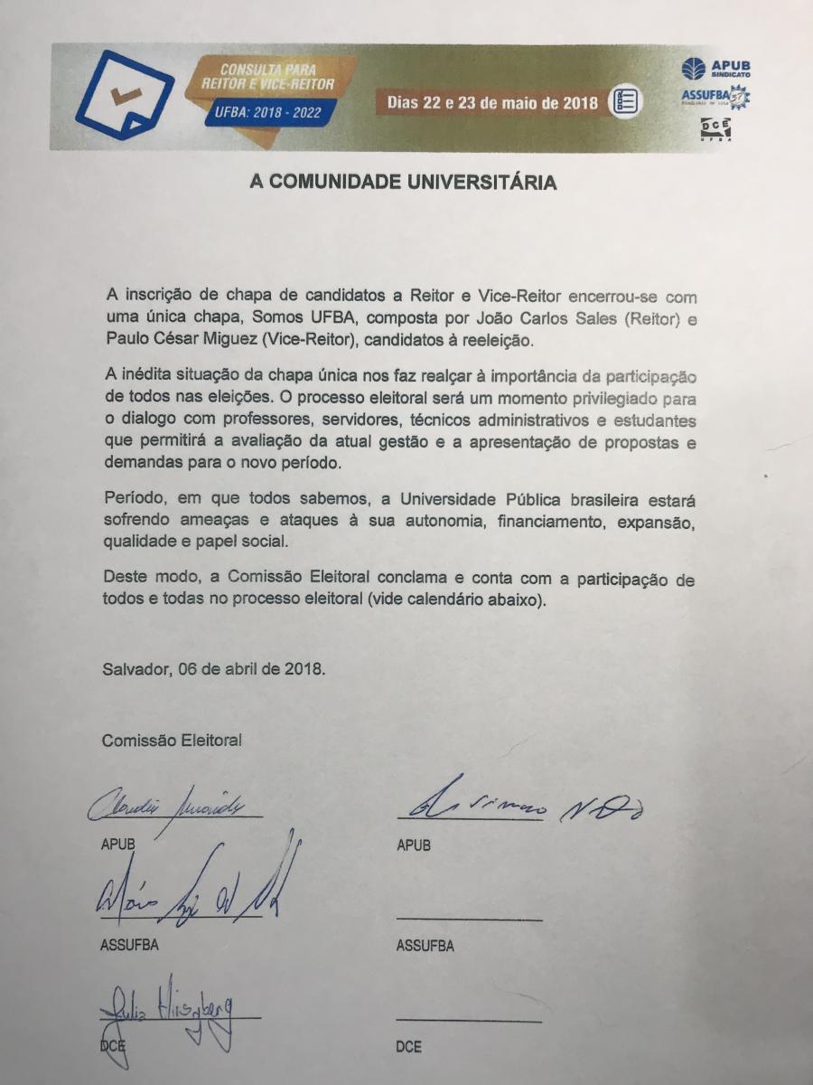 A inédita situação da chapa única nos faz realçar à importância da participação de todos nas eleições. O processo eleitoral será um momento privilegiado para o dialogo com professores, servidores, técnicos administrativos e estudantes que permitirá a avaliação da atual gestão e a apresentação de propostas e demandas para o novo período.